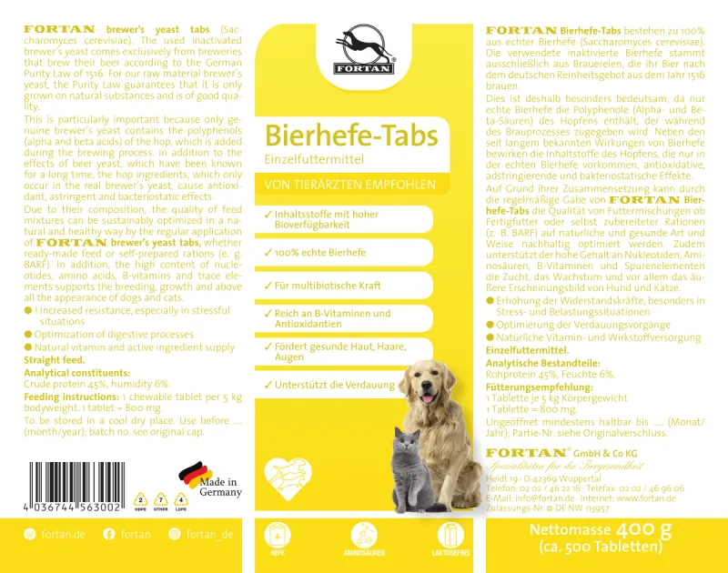 FORTAN – Tabletele cu drojdie de bere sunt un supliment natural valoros pentru câini și pisici, bogat în vitamine din complexul B, proteine, minerale și enzime esențiale. Drojdia de bere contribuie la menținerea unei blăni sănătoase, strălucitoare și a unei pielii fără iritații sau descuamări, având totodată efect benefic asupra digestiei, apetitului și sistemului imunitar. Aceste tablete sunt potrivite pentru toate vârstele și rasele, fiind ideale în perioade de năpârlire, recuperare sau creștere activă. Textura crocantă le face ușor de administrat, fie ca atare, fie amestecate în hrană. Ambalajul de 400 g oferă un stoc generos pentru administrare zilnică.