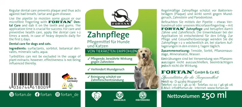 FORTAN Dental Care 250ml este o soluție lichidă special formulată pentru igiena orală zilnică a câinilor și pisicilor. Cu acțiune antibacteriană naturală, produsul contribuie la reducerea plăcii bacteriene și a tartrului, împrospătează respirația și susține sănătatea cavității bucale. Poate fi aplicat direct sau adăugat în apa de băut, fără a provoca disconfort sau reacții neplăcute.