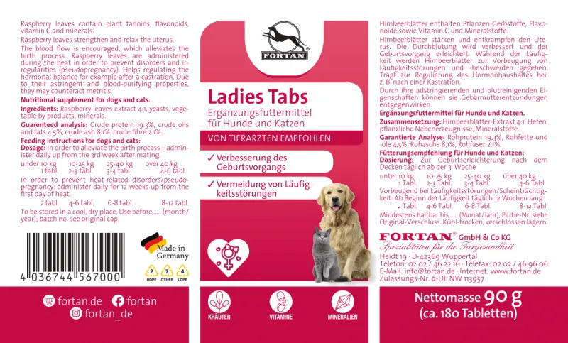 FORTAN Femele 180 tablete este un supliment nutritiv natural special creat pentru femelele de câini și pisici, în special în perioadele de călduri, gestație și alăptare. Conține extract de frunze de zmeură, recunoscut pentru proprietățile sale benefice asupra sistemului reproducător feminin. Formula este completată cu vitamine, minerale și aminoacizi esențiali pentru a sprijini sănătatea generală, fertilitatea și recuperarea postnatală.