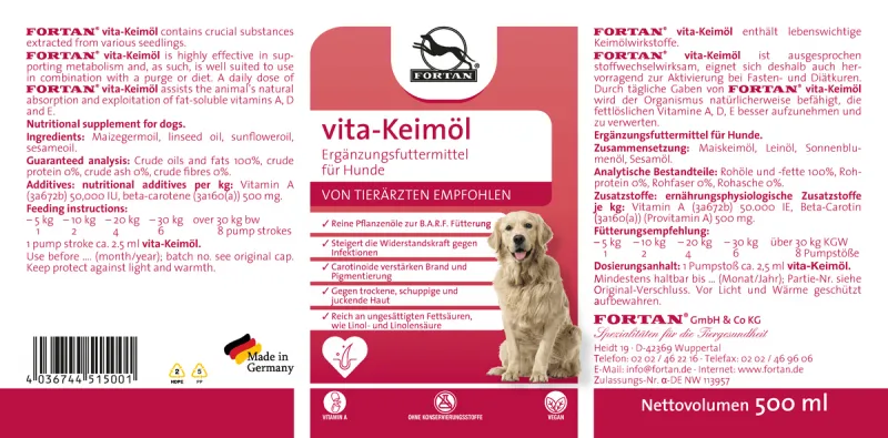 FORTAN Vita 500 ml este un supliment nutritiv lichid pe bază de ulei de germeni de grâu, special conceput pentru câini. Acesta furnizează o sursă naturală de acizi grași nesaturați și este îmbogățit cu vitaminele A și E, esențiale pentru o piele sănătoasă, o blană lucioasă și susținerea sistemului imunitar. Ideal în perioade de schimbare a blănii, efort intens, recuperare sau dietă BARF.